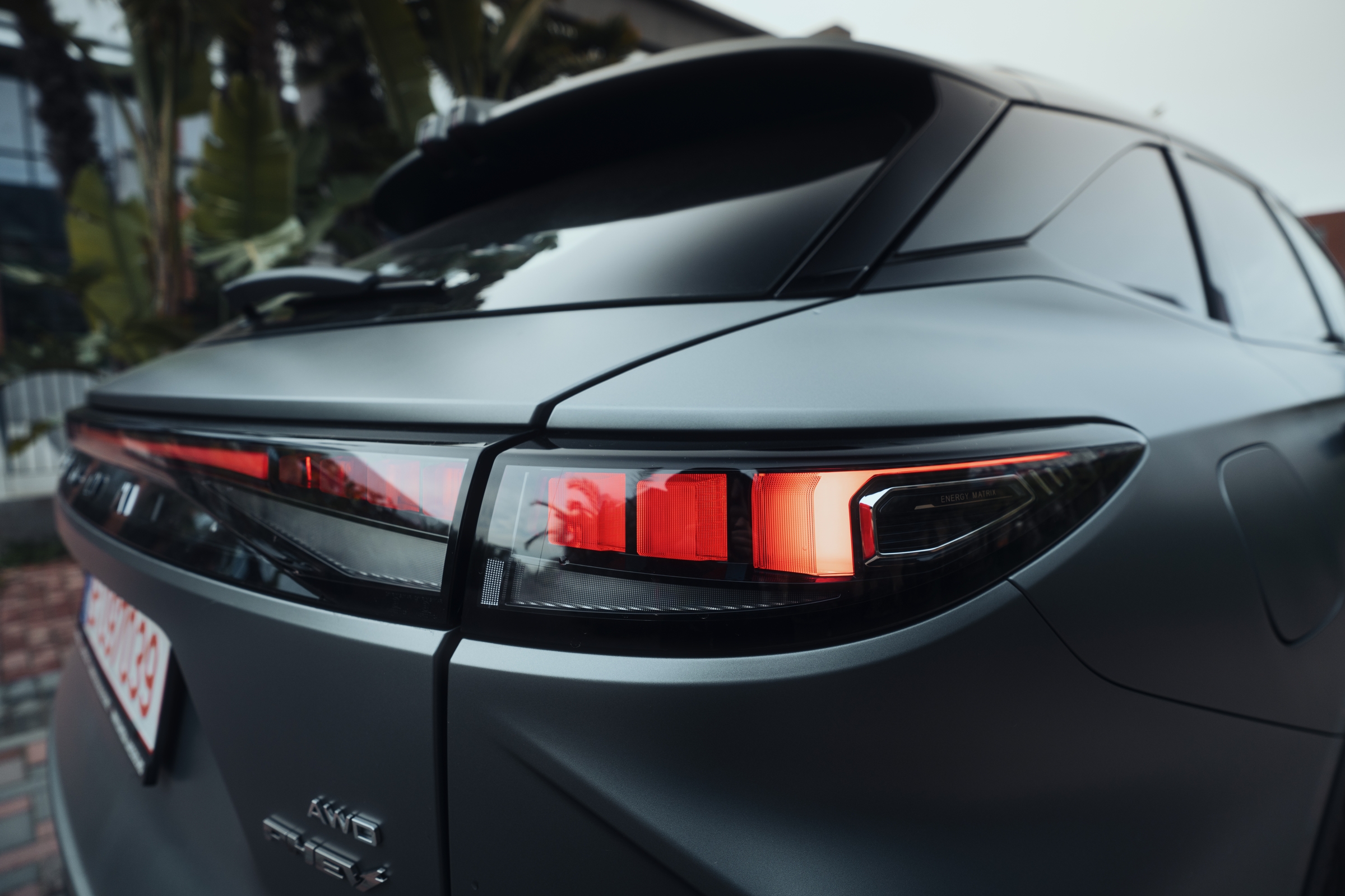 Aș calibra puțin mai bine modul în care este trimisă puterea la puntea spate. Pentru că avem o punte spate motorizată electric, care în cazul unei accelerații ceva mai viguroase în condiții de carosabil cu aderență redusă (ploaie, în cazul testului) duce la ruperi de aderență care pot conduce la pierderea controlului. Mult prea brutal este livrat cuplul motor la puntea spate, mult prea repede este ruptă aderența, mult prea greu intervin sistemele de asistență. Și nu pot vorbi despre o învățare a modului în care dozezi pedala de accelerație.