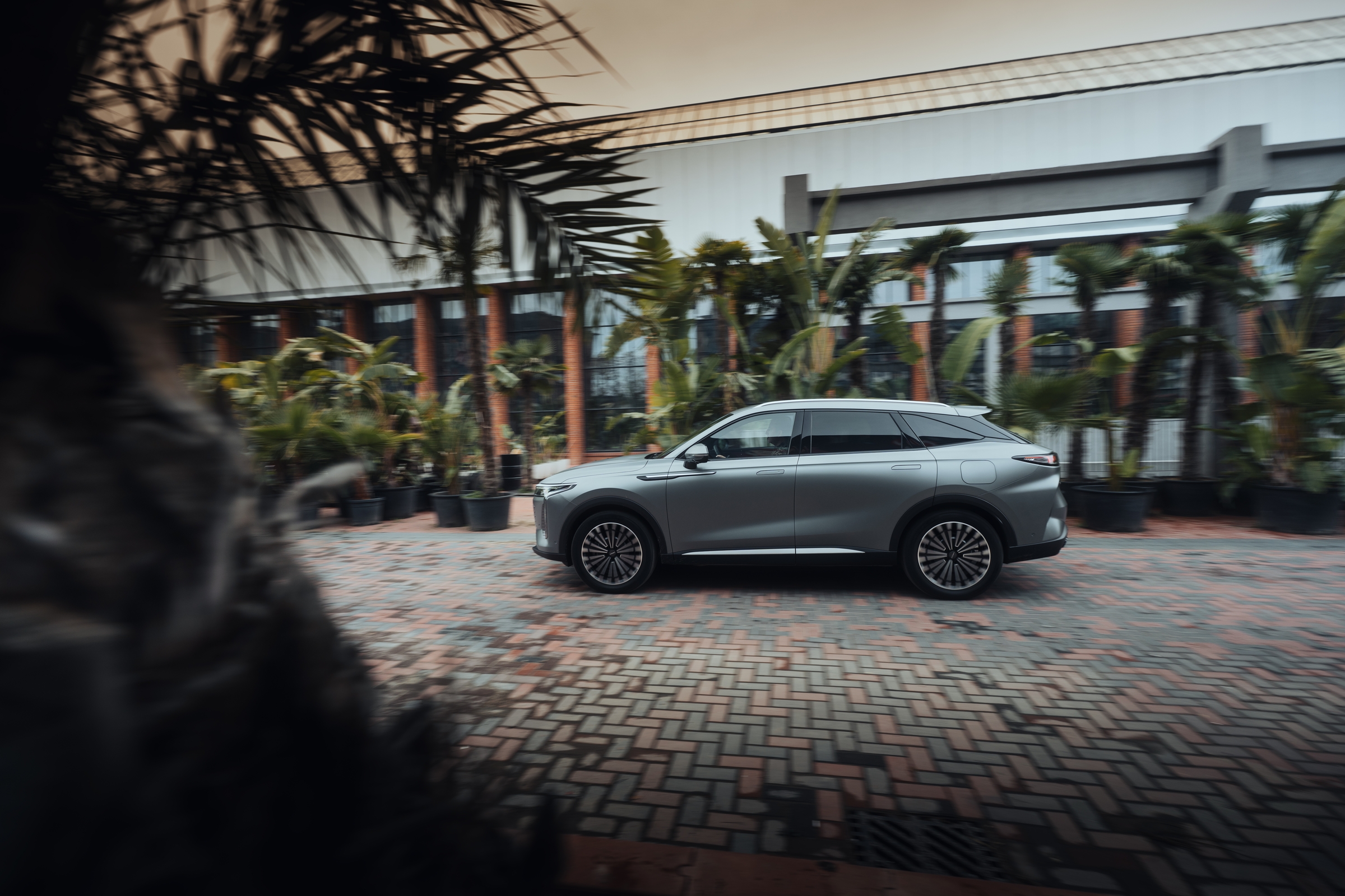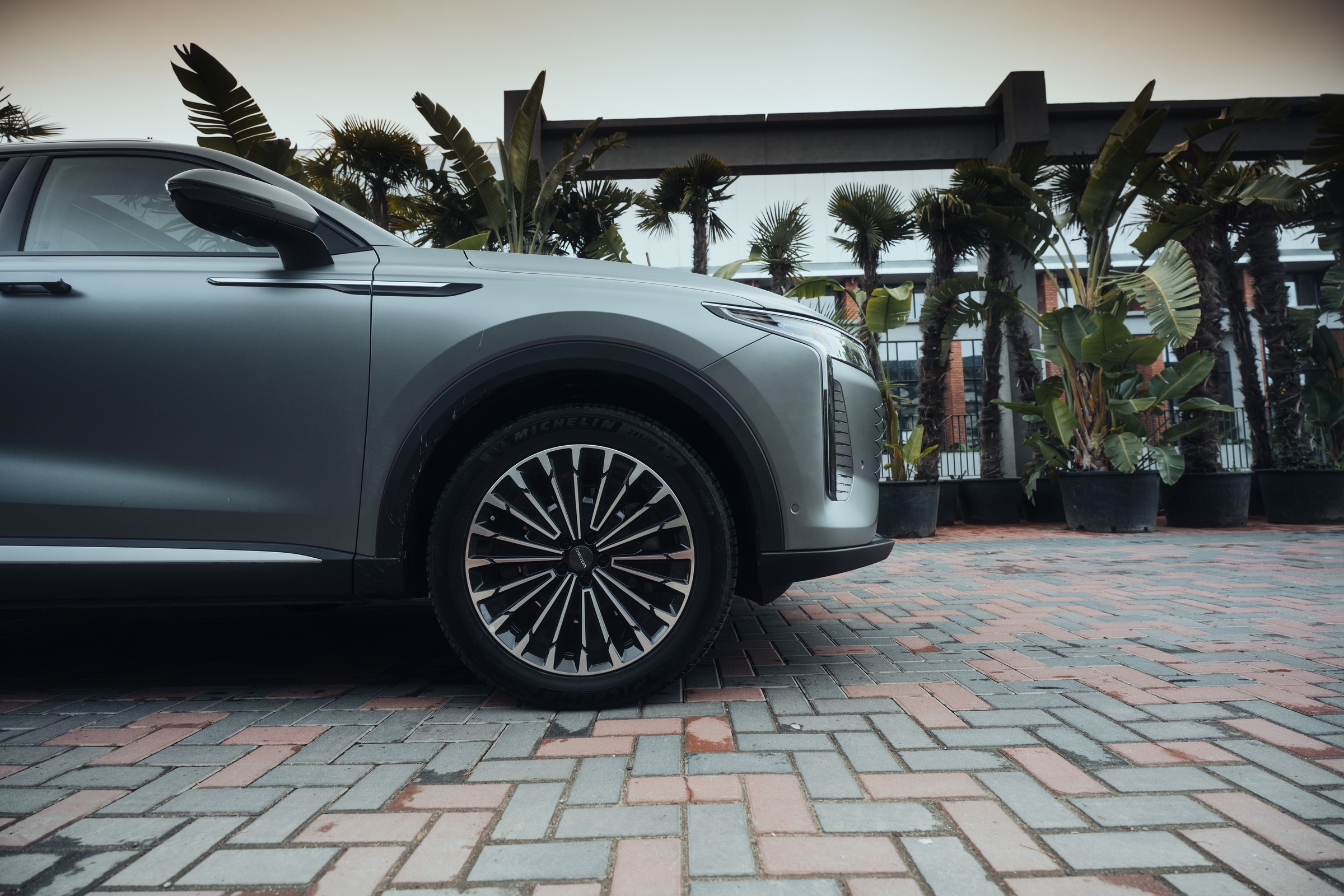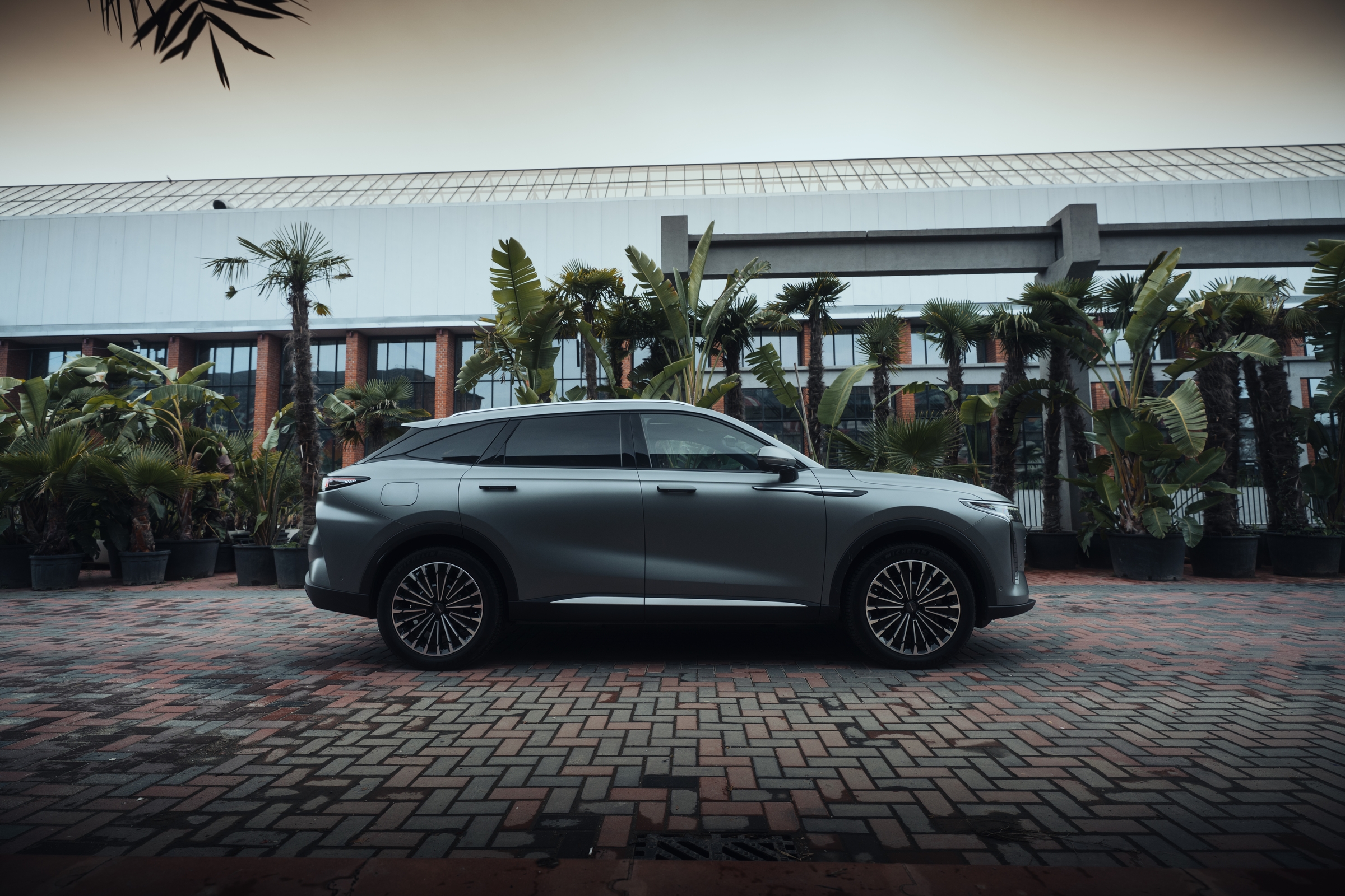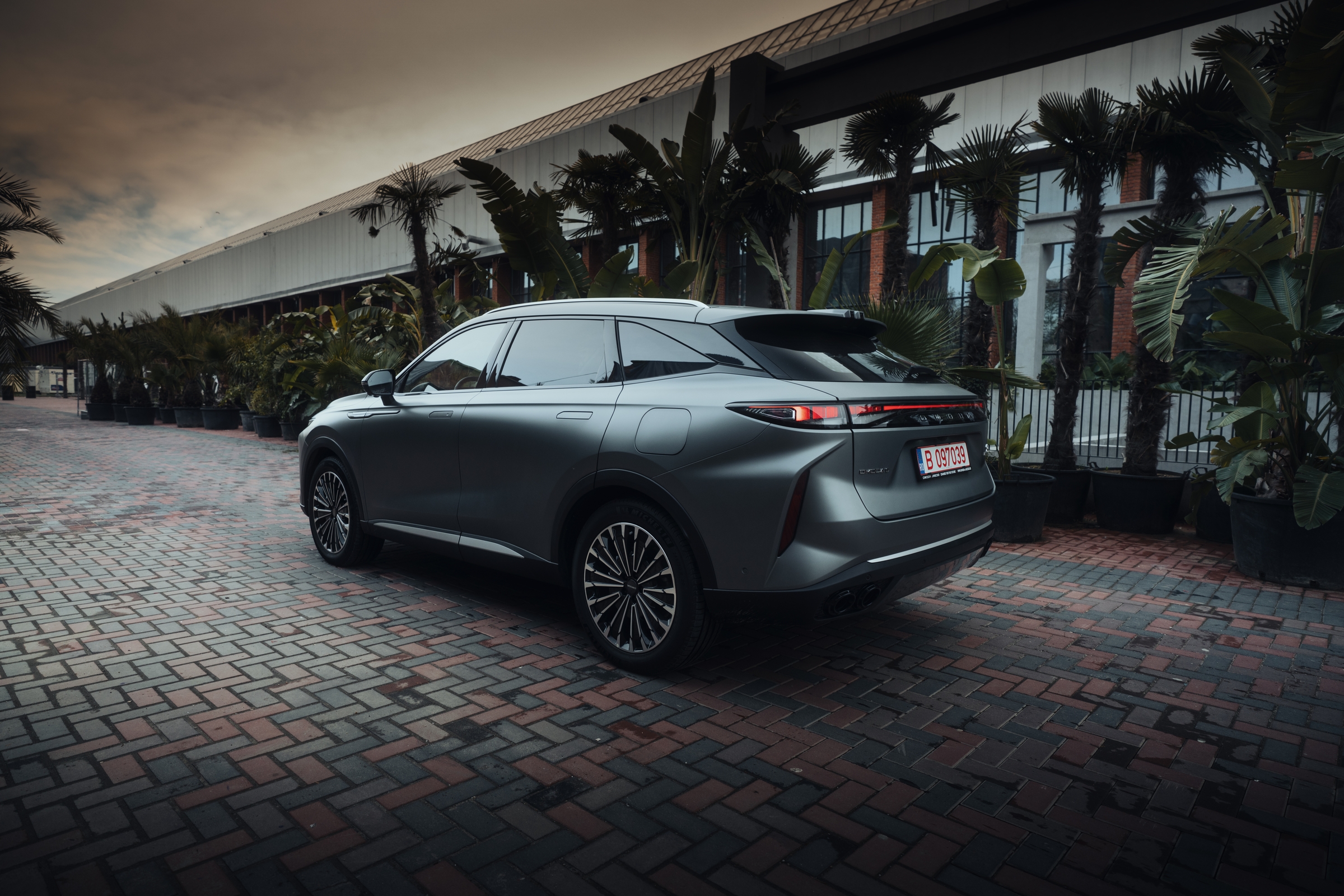 Omoda 9 SHS, un SUV cu parfum de SAC, dacă ar fi să adoptăm acronimul creat de BMW pentru SUV-urile cu parfum de coupé. Un model impozant, masiv, cu o linie mediană înaltă care îți induce senzația de monolit. Și totuși, această geometrie are eleganța ei. Lungimea de 4.775 mm este ușor estompată de cei 1.920 mm lățime, iar înălțimea are doar 1.671 mm, deși lasă impresia că este mai „cocoțată”.