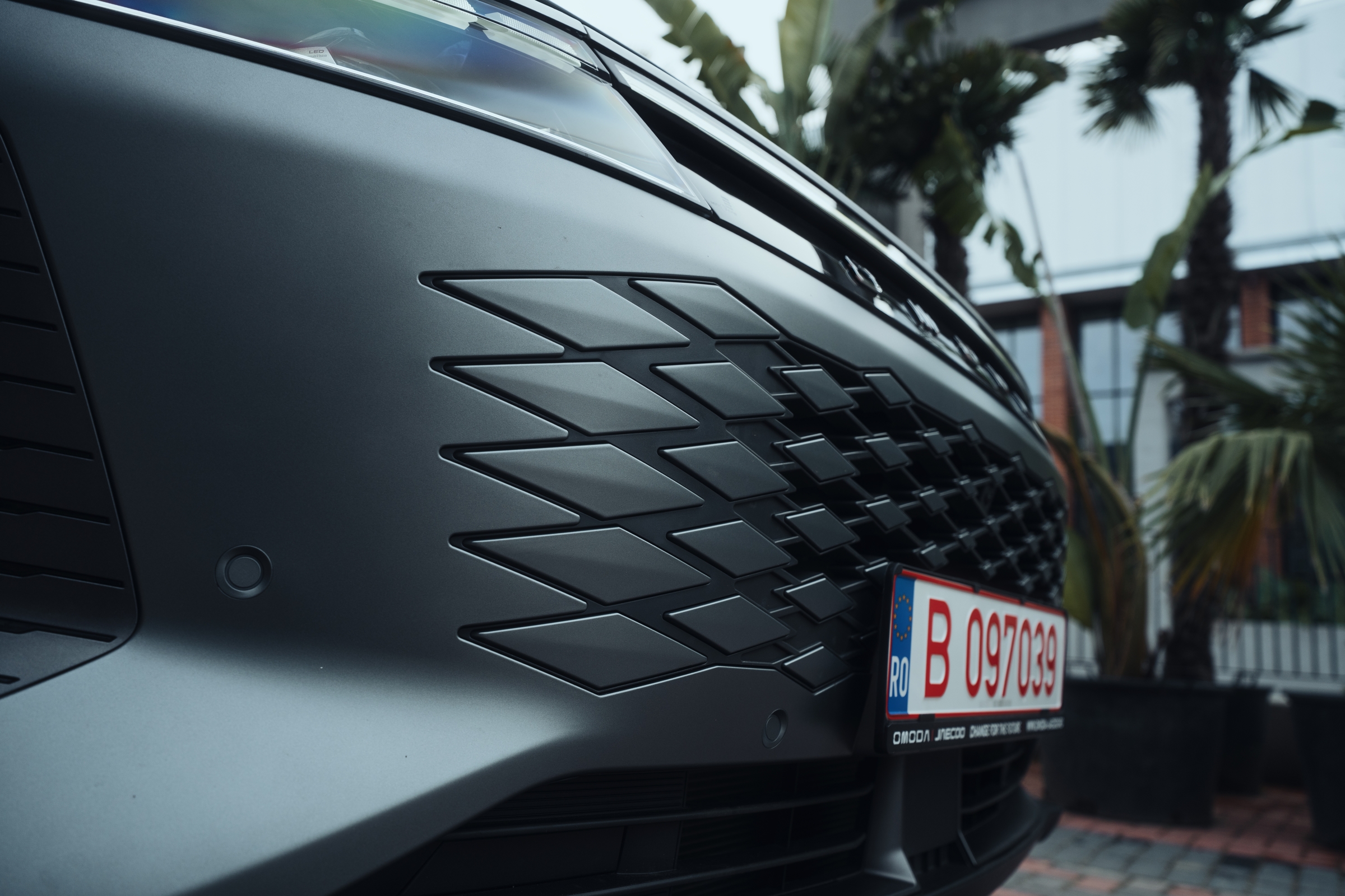 Aș spune că linia exterioară este foarte curată și deloc încărcată cu ornamente gratuite. Aș putea spune că afișează o surprinzătoare maturitate la capitolul design exterior. Nici jantele de 20 inch echipate cu anvelope Michelin 245/50 R20 nu par exagerate în linia laterală. Ampatamentul de 2.800 mm apropie modelul de segmentul mare. Poate puțin exagerat am găsit evacuarea cu patru terminații: ea rimează cu cei 455 CP, dar nu neapărat și cu cilindreea motorului.