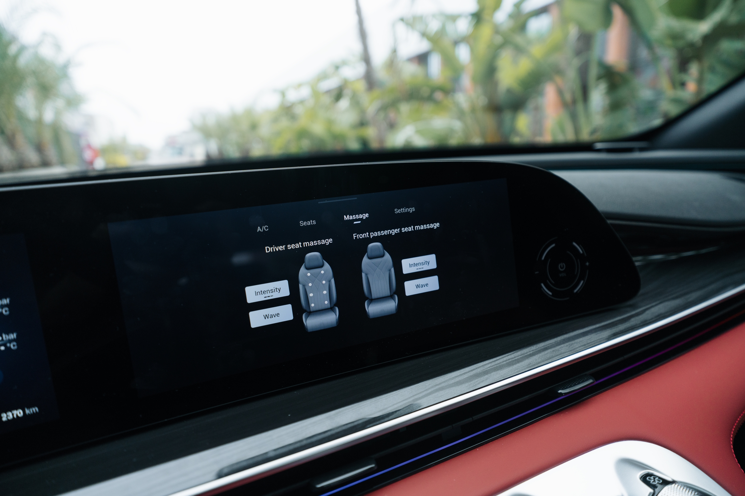 Puțin lipsită de ergonomie interfața sistemului infotainment. Spre exemplu, există pictograme care îmi oferă acces direct la funcții precum update pentru sistemul de operare sau al hârții sistemului de navigație, dar funcțiile de confort (AC, masaj scaune, încălzire/ventilație scaune și setări) sunt într-un meniu cu patru ferestre distincte. Nu m-ar fi deranjat să fie invers, să am acces direct la setări precum masaj și să regăsesc undeva într-un submeniu opțiunile de update.
