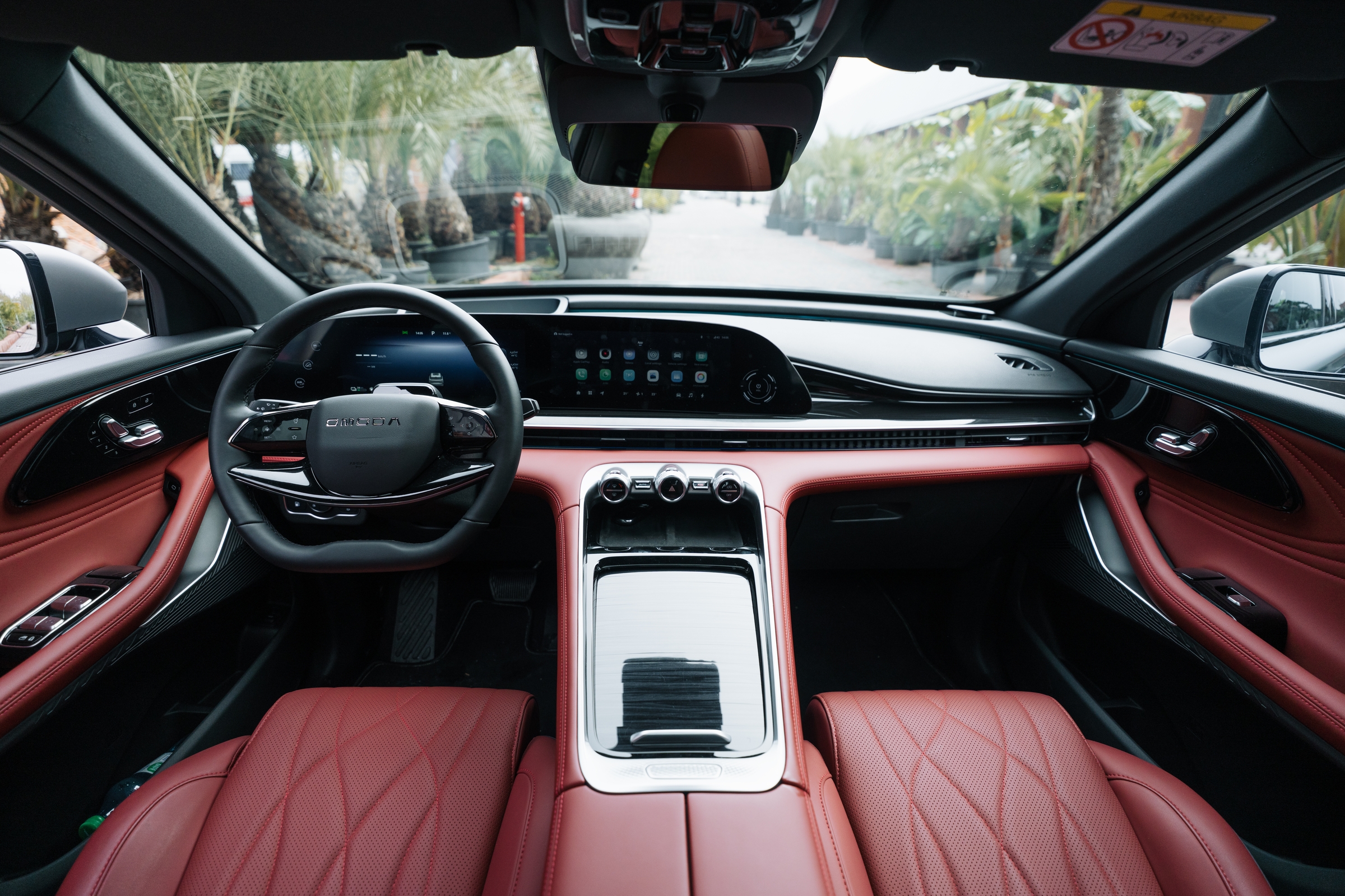 Nu exagerez cu nimic, în clipa în care am deschis portiera am fost izbit de un parfum de Mercedes-Benz. Da, cred că ar fi un concurs interesant ghicitul mașinilor după mirosul interiorului. Nu știu cum, nu știu de ce, dar interiorul lui Omoda 9 SHS abundă de repere cunoscute de la constructorul german până la nivelul în care ai putea fi tentat să crezi că ești într-un model cu stea pe capotă. Este rău? Nu, doar că partea cu autenticitatea parcă are de suferit. Acum, dacă este să mă împiedic de puțină sinceritate, parcă celor de la Omoda le iese mai bine pe alocuri decât germanilor.