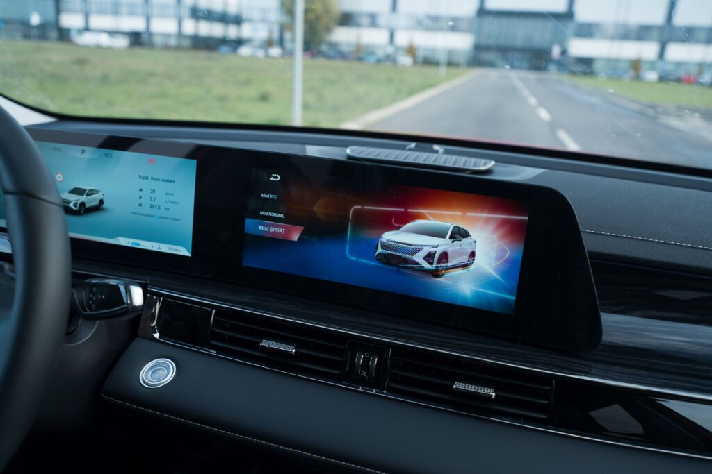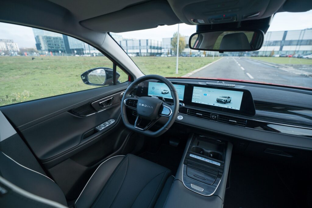 Este o inspirație puternică din cel găsit pe modelele Tesla, doar că are și ceasuri de bord. E simplu de folosit și mi-a plăcut că au păstrat butoane pe consolă pentru funcțiile uzuale. Sunt ordonate și poziționate chiar bine. Unitatea multimedia se mișcă foarte bine, iar integrarea Apple CarPlay a fost iute și ușor de folosit. Mi-a luat puțin să îmi dau seama cum ies din meniul respectiv, dar altfel am constatat că este un sistem destul de reușit.