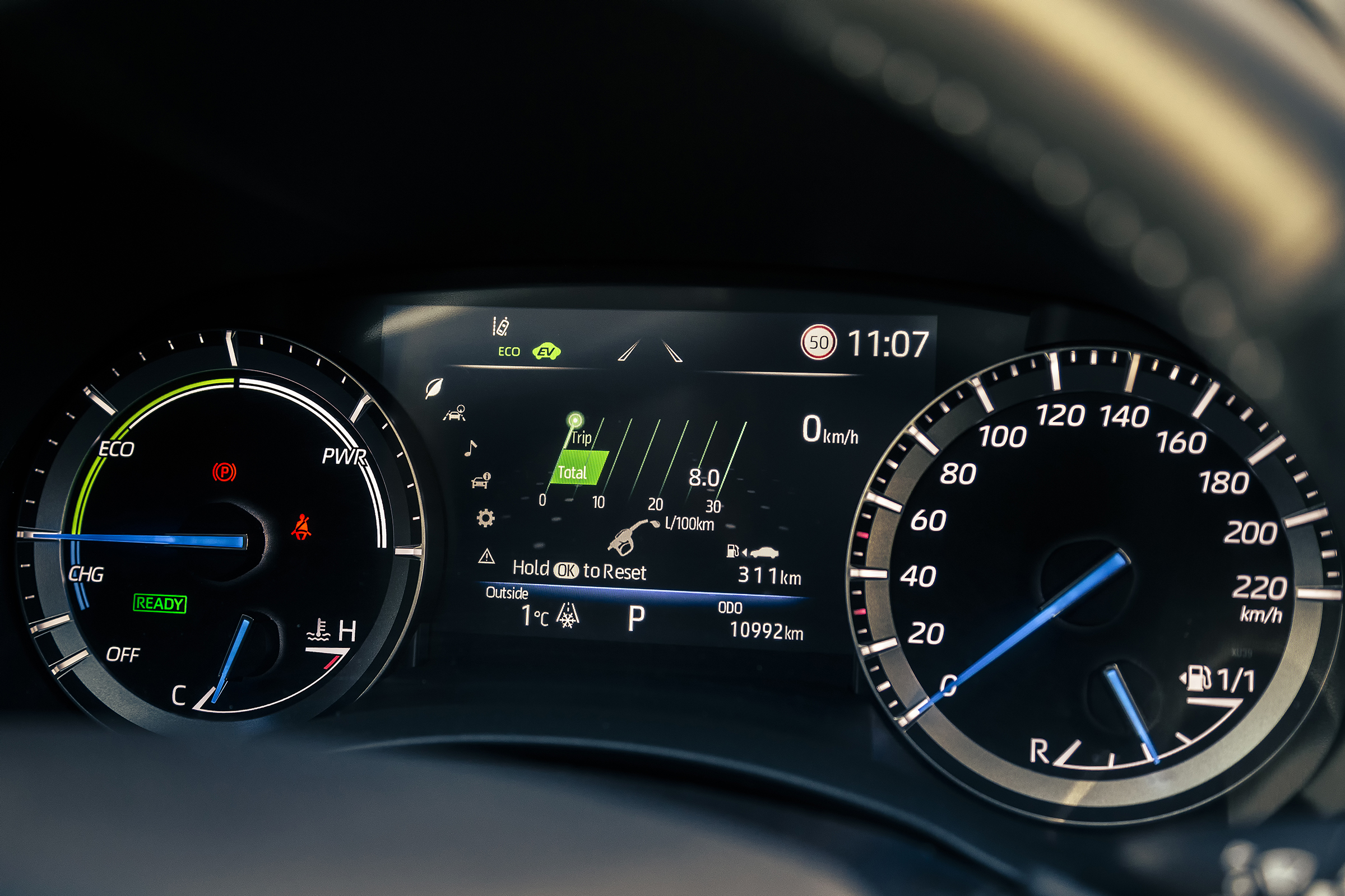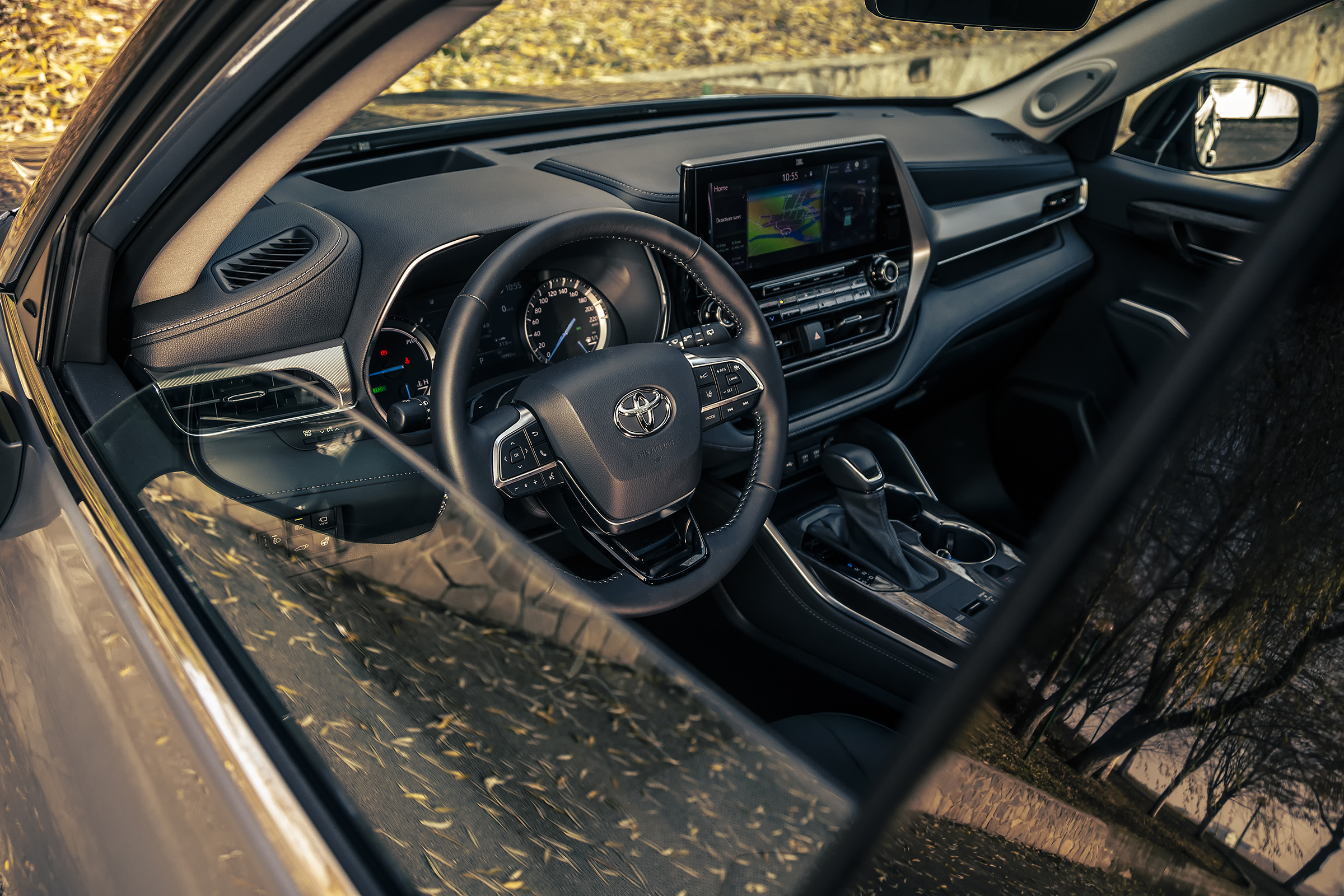 Sistemul de propulsie. Soluția folosită de Toyota cu motor termic de 2.5 litri și două motoare electrice este deja un etalon în domeniu. Iar Highlander confirmă acest lucru. Sistemul are trei moduri de rulare: eco, normal și sport. Plus un mod trail, acționabil printr-un buton separat, pentru excursii pe drumuri neasfaltate.