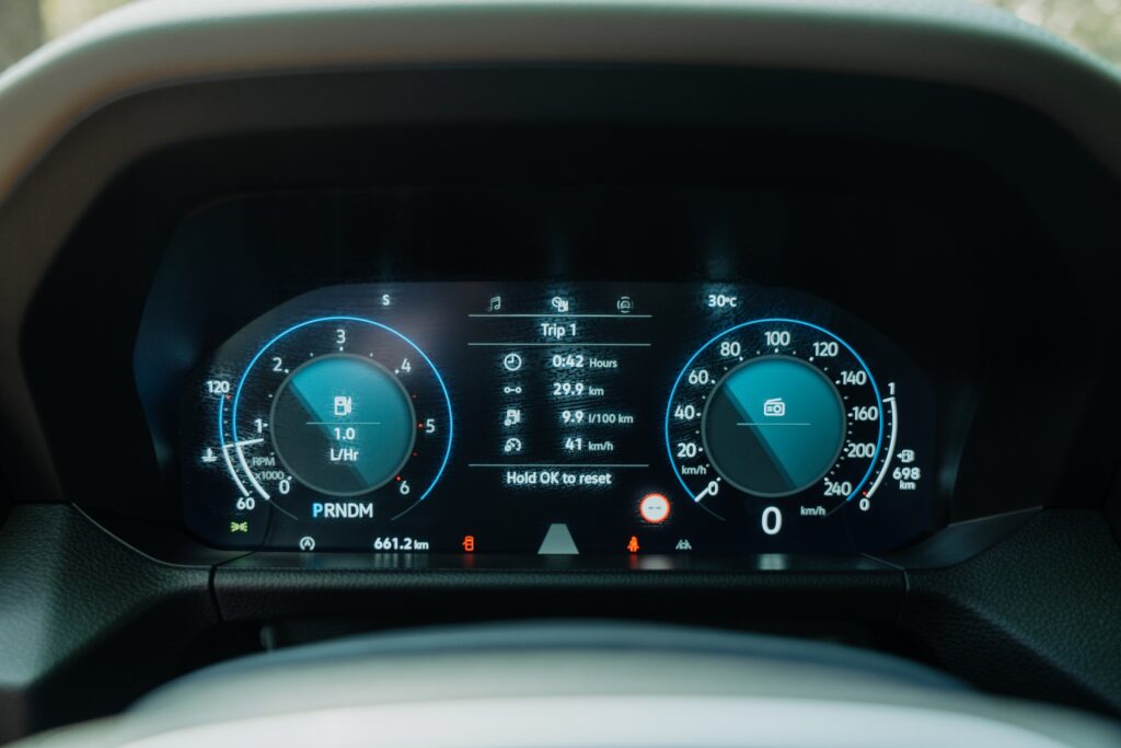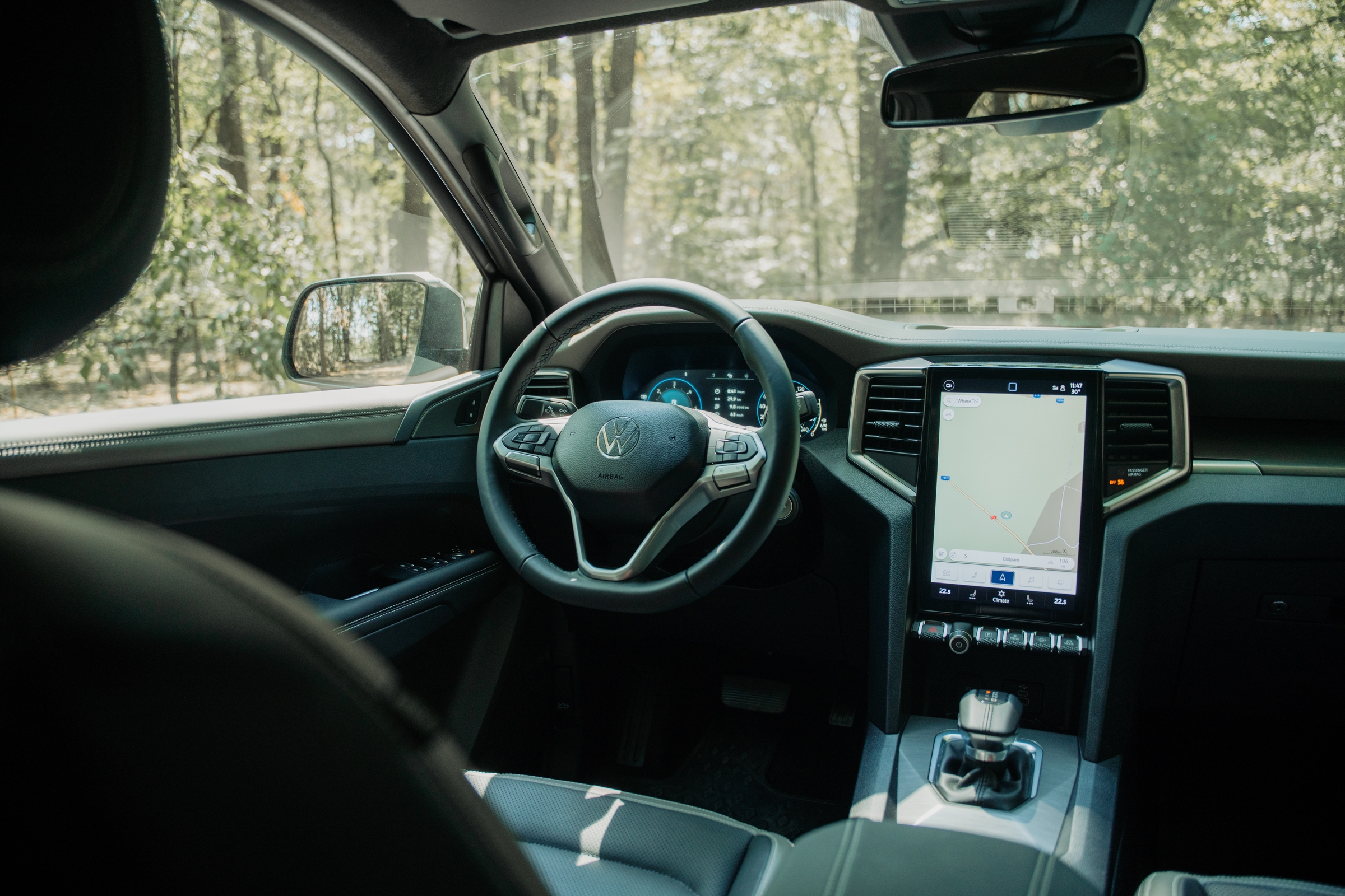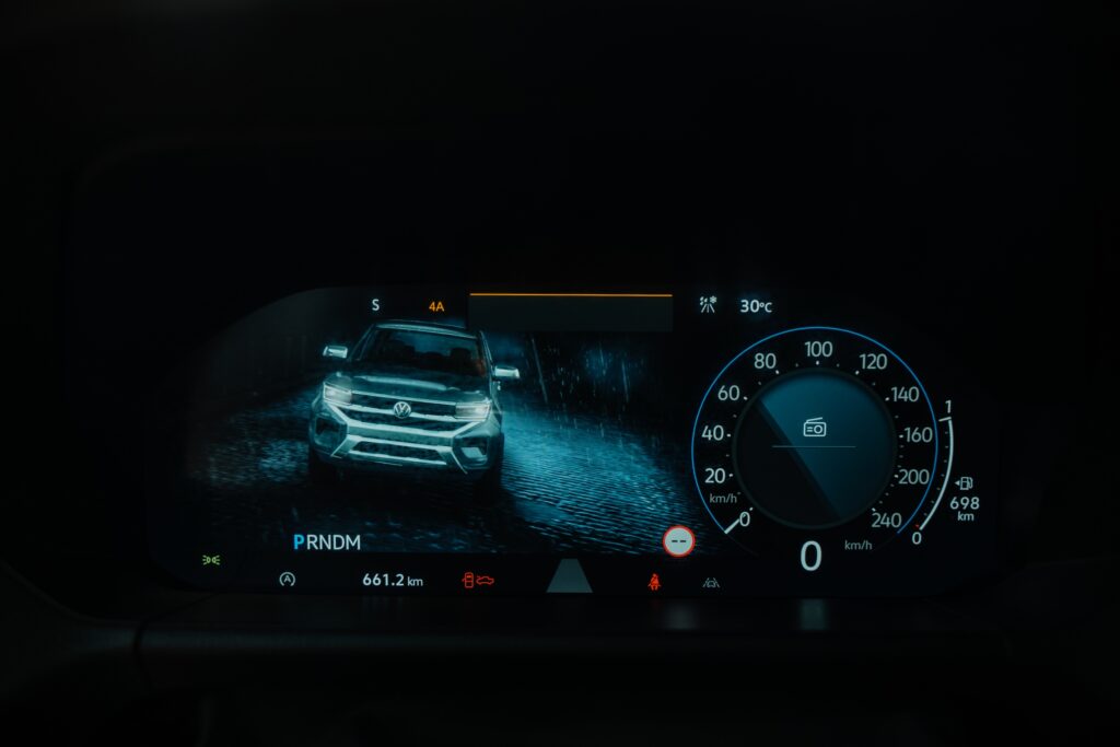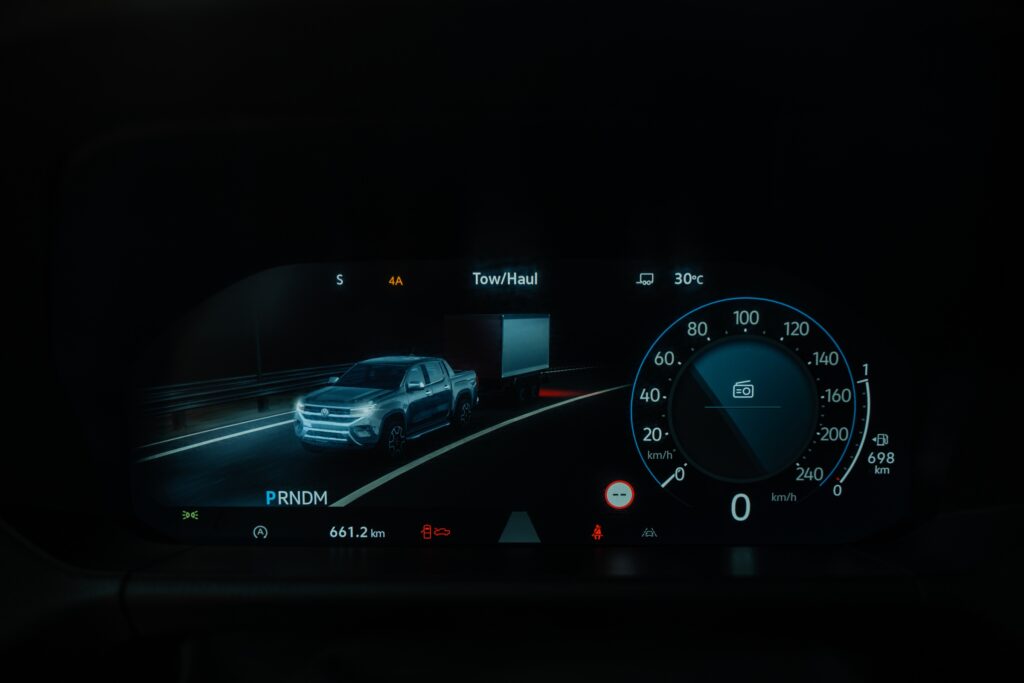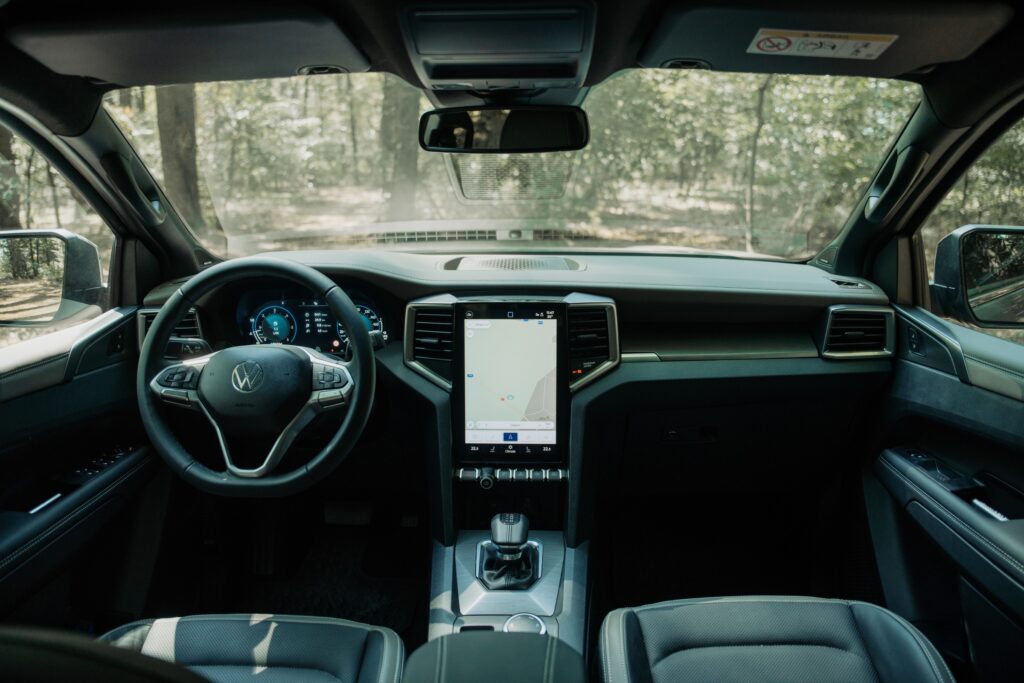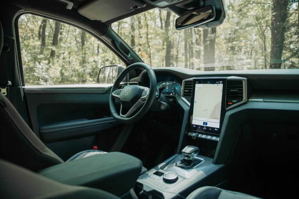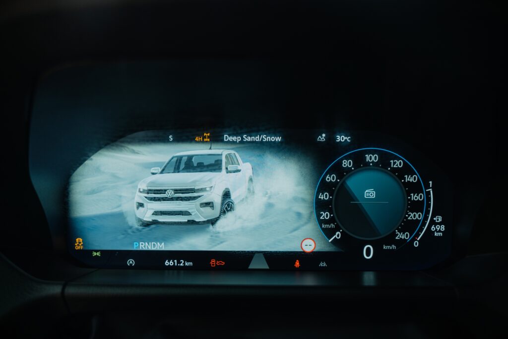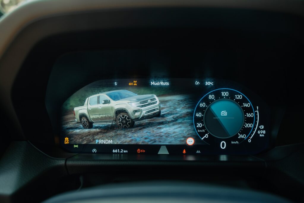 Nu sunt vreun fan al meniurilor pom de crăciun, dar meniul celui de la Amarok pare evadat de la cursul de desen tehnic: dacă fundalul oferea o sugestie de hârtie milimetrică, puteai avea senzația că ești la cursuri. Și toată această rigoare intră ușor în conflict cu „dramatismul” grafic afișat de tabloul de bord la selectarea unui mod de rulare. Aș amenda puțin și ergonomia – apeși un buton al claviaturii, după care intri într-un meniu al display-ului central de unde alegi ce vrei și apoi urmărești pelicula de pe display-ul de 12.3 inch al tabloului de bord. Conectivitate este ușoară, fără a fi nevoit să urci la volan cu vreo diplomă în acest sens.