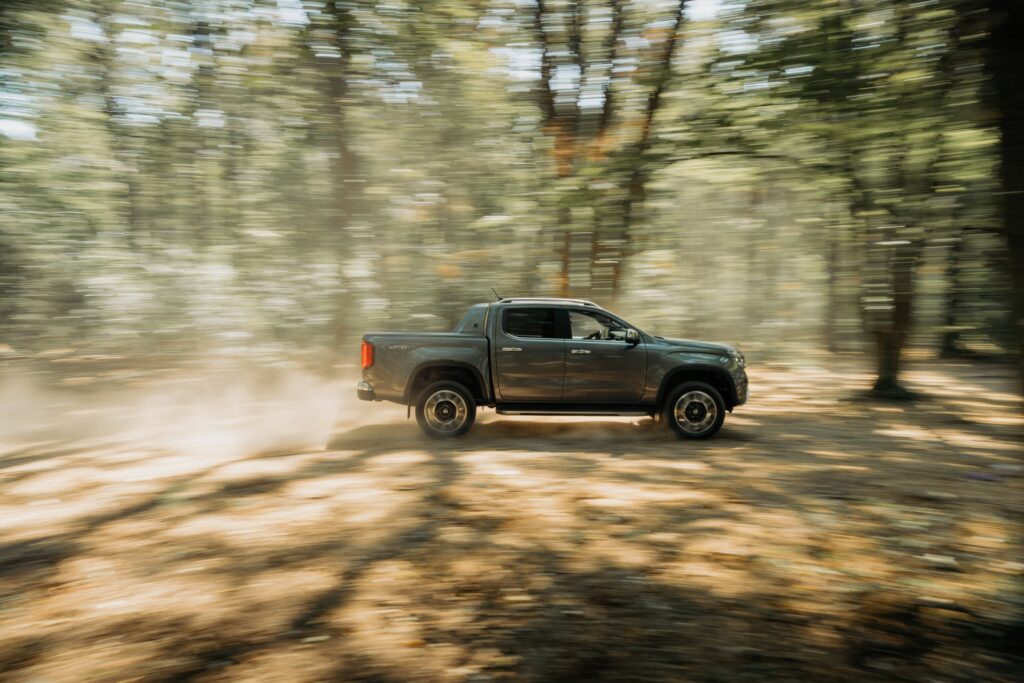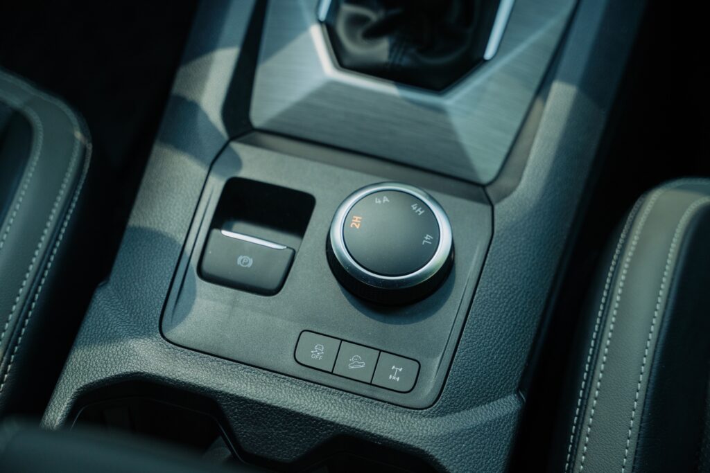 Nu prea îți vine să te urci în salopetă și cu mânuși de lucru în mașină. Materialele și calitatea asamblării sunt la nivelul diviziei auto, nu cea comercială. Masivitatea exteriorului se regăsește și în dimensionarea generoasă a comenzilor. Selectorul rotativ al cutiei de transfer sau cel al cutiei de viteze sunt detalii robuste, masive. E bine, totuși, că divizia comercială nu a „împrumutat” volanul cu „butoane touch” de la divizia auto.