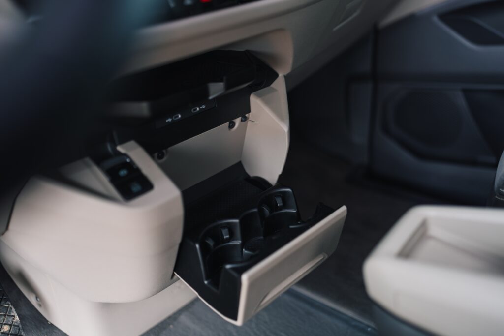 În această configurație, doar cu două locuri în zona din mijloc, accesul la locurile spate se poate face și printre scaune, fără a mai fi nevoie de plierea spătarului și culisarea scaunelor spre față. Spătarul scaunelor mediane și al celui din mijloc de pe al treilea rând, dacă sunt pliate devin măsuțe care includ suporturi pentru pahare și o decupare în care poate fi depozitat un telefon. Pasagerii spate au în panourile laterale buzunare, iar în partea superioară suport pentru pahare și sloturi USB-C. Apropo de sloturile de încărcare, la acest capitol mașina stă foarte bine.