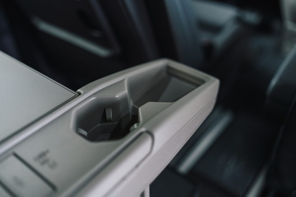 Portierele față au două buzunare, cel inferior este generos, dar greu accesibil în timp ce conduci, însă compensează cel median unde poți depozita diverse utile la drum lung. În planșa de bord, în zona inferioară, se află un suport de pahare rabatabil care include și un spațiu de depozitat telefonul. Am descoperit că am avut tendința de a depozita băuturile pe consola centrală culisată, pentru că am putut regla poziția ei, spațiul din bord găsindu-l ușor incomod pentru că implică modificarea poziției la volan pentru a ajunge la ce este depozitat acolo.