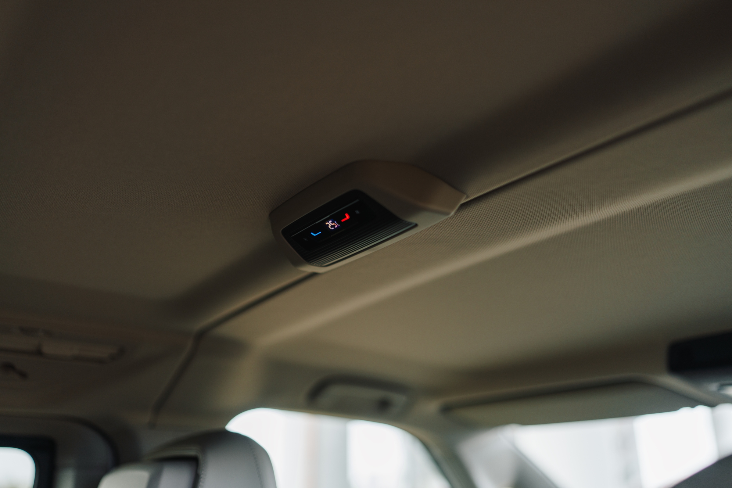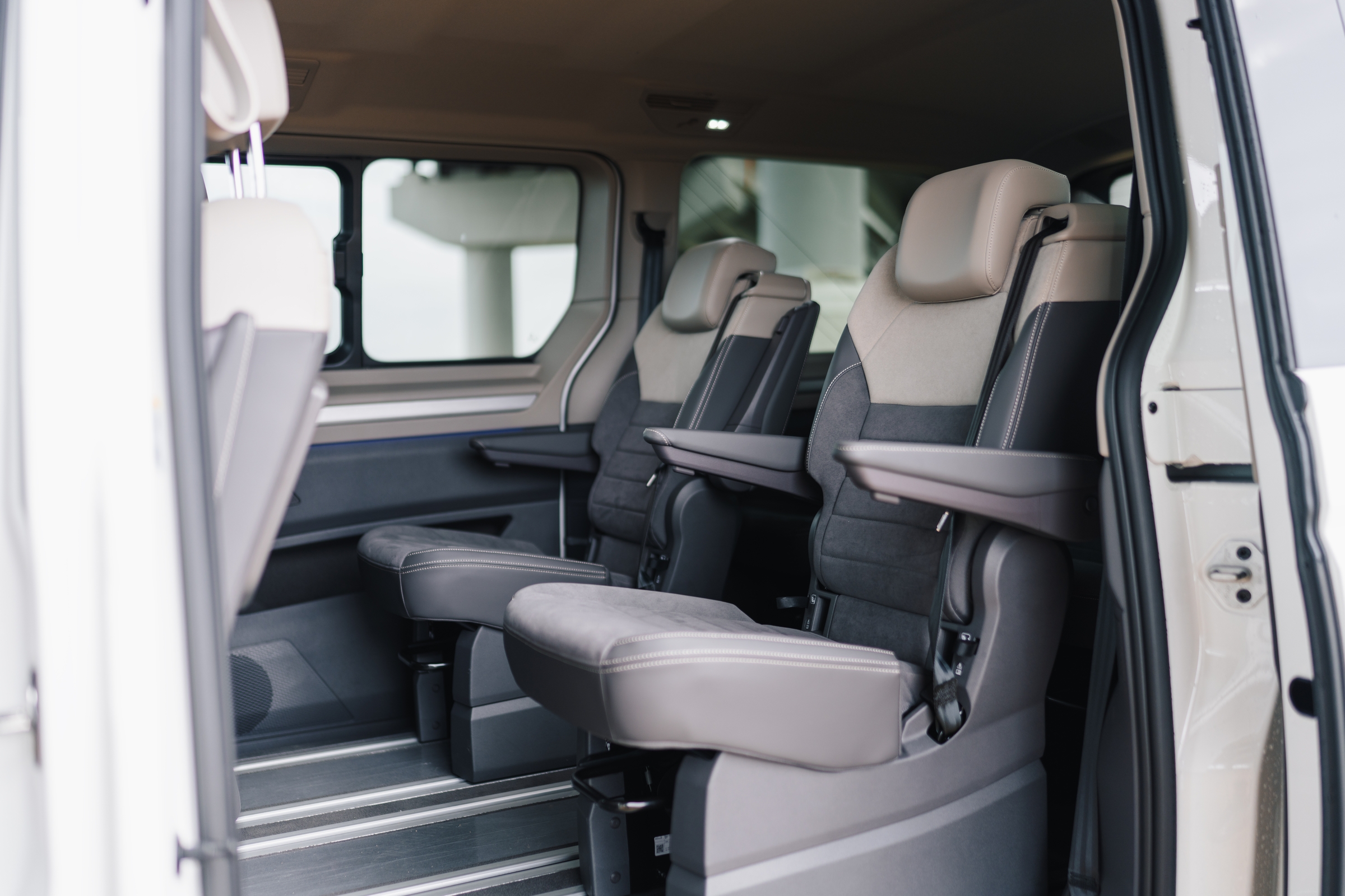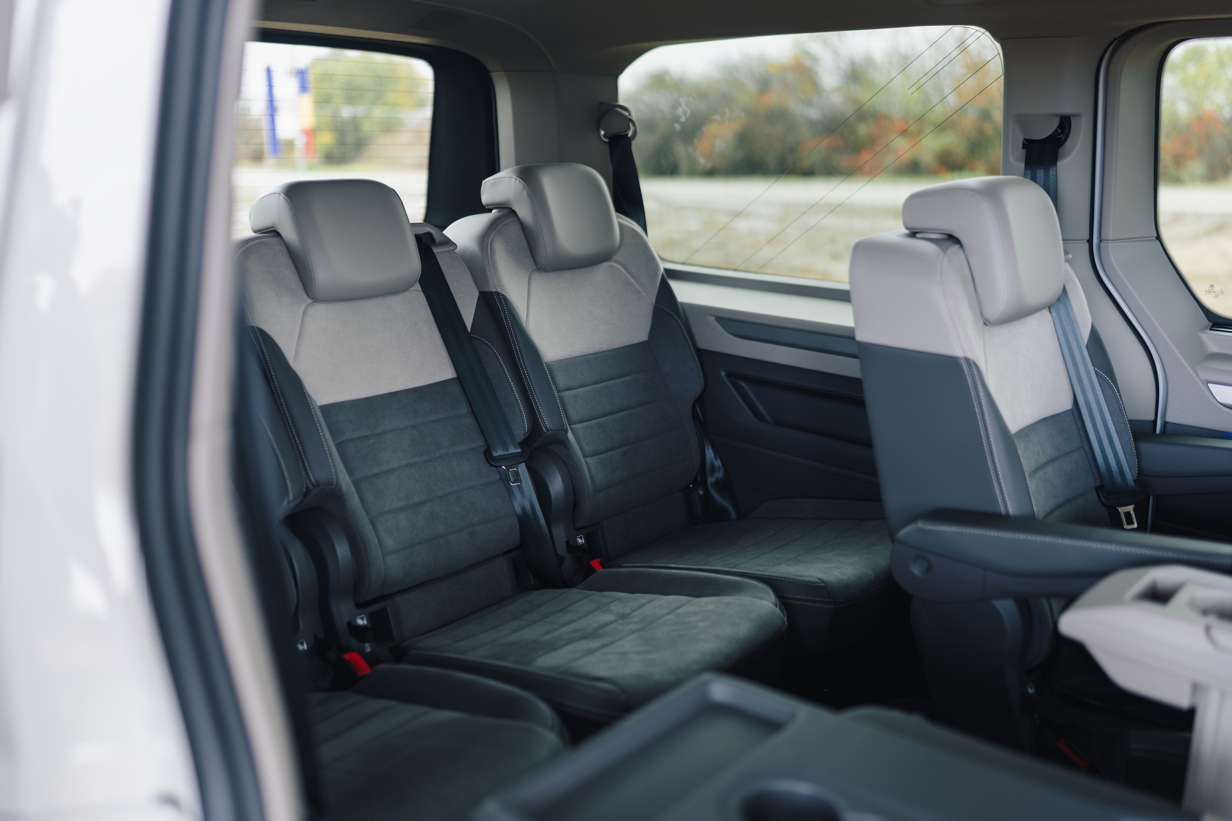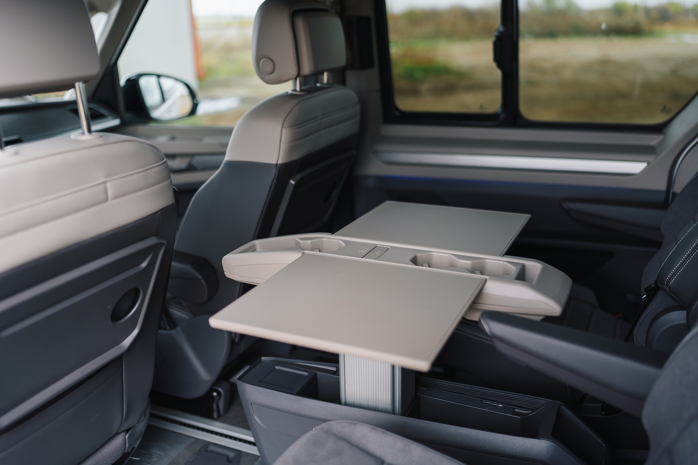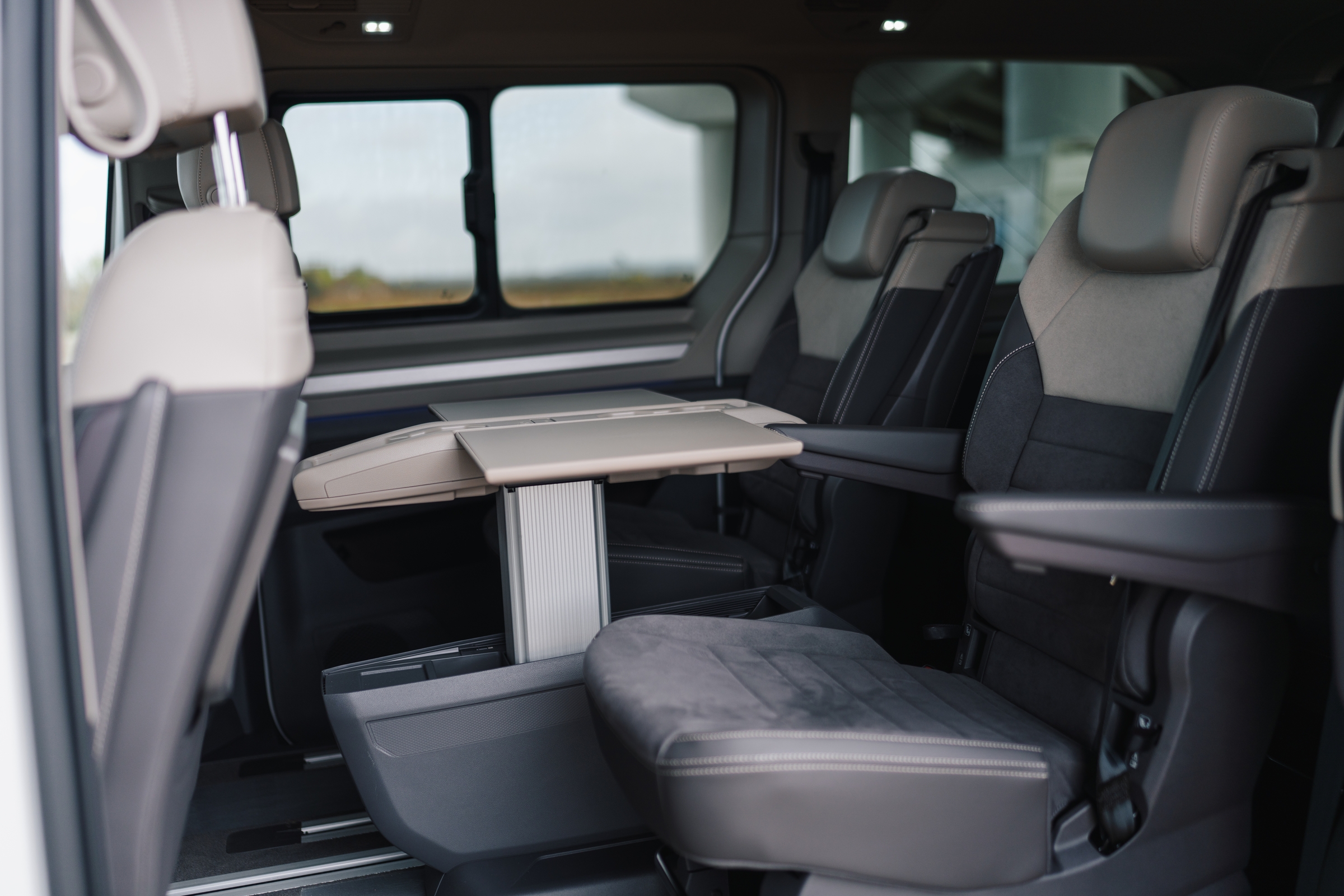 În această configurație, doar cu două locuri în zona din mijloc, accesul la locurile spate se poate face și printre scaune, fără a mai fi nevoie de plierea spătarului și culisarea scaunelor spre față. Spătarul scaunelor mediane și al celui din mijloc de pe al treilea rând, dacă sunt pliate devin măsuțe care includ suporturi pentru pahare și o decupare în care poate fi depozitat un telefon. Pasagerii spate au în panourile laterale buzunare, iar în partea superioară suport pentru pahare și sloturi USB-C. Apropo de sloturile de încărcare, la acest capitol mașina stă foarte bine.
