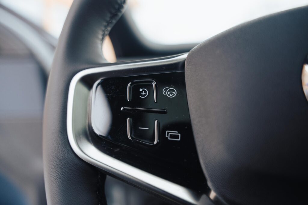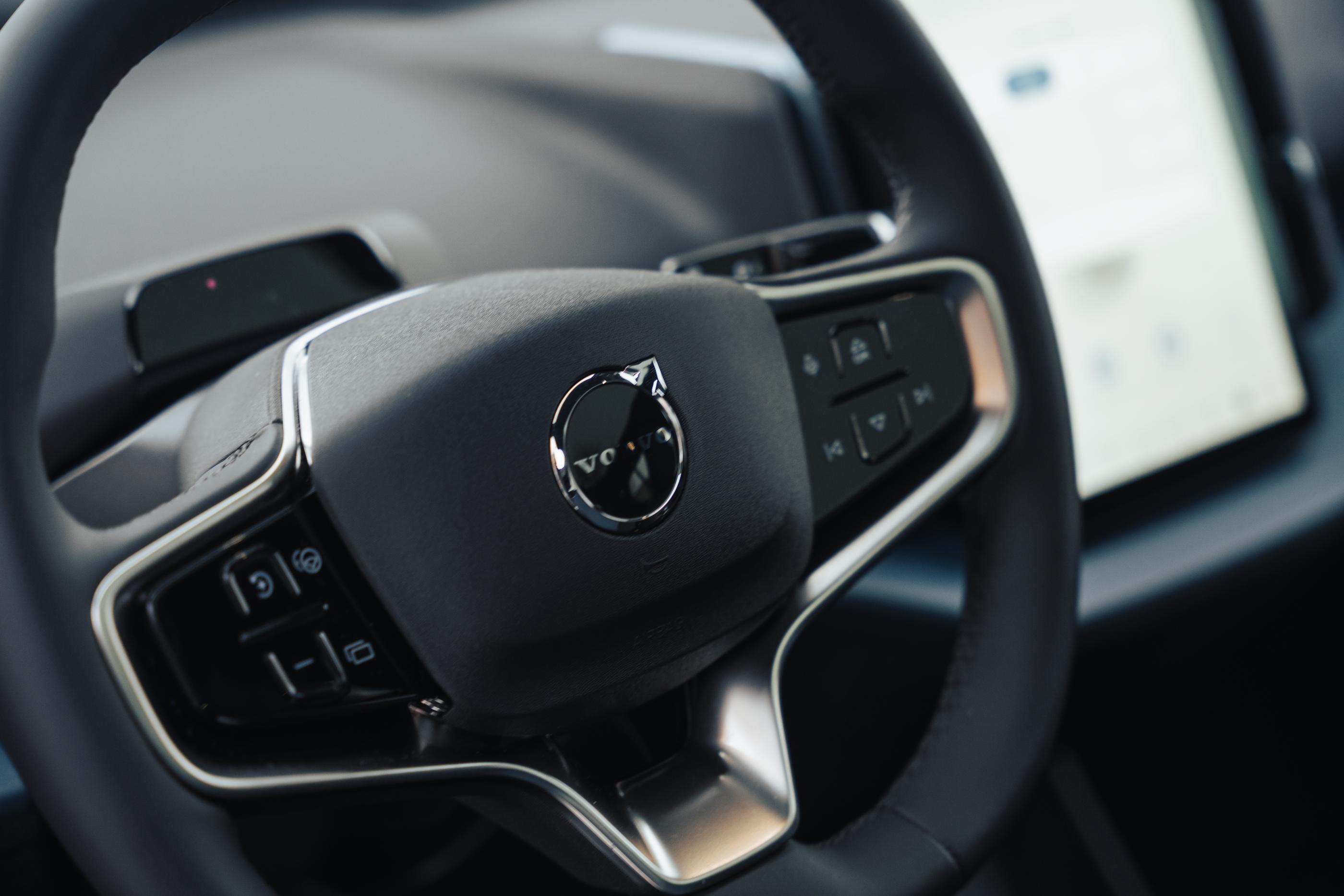 Apoi, cu un mare asterisc, aș zice și o cheie cu butoane, dacă tot a decis Volvo să vină și cu o astfel de soluție. Ca să înțelegeți, mașina se încuie/descuie automat atunci când detectează prezența cheii în proximitate. Doar că, uneori (cu accent pe uneori), nu se întâmplă asta: e nevoie de un pic de timp până sistemele mașinii pricep că în apropiere e și cheia, timp în care tu te verifici ca bezmeticul prin buzunare să nu cumva s-o fi uitat pe undeva. Sigur, există și alte opțiuni pentru a intra în mașină: un card NFC sau aplicația mobilă. Probabil că 99,99% dintre utilizatori vor miza exclusiv pe ultima variantă. Cum spuneam și mai sus: am condus o Tesla Model 3 pentru suficient de mult timp încât să-mi dau seama că o cheie fizică nu e necesară. Dar dacă tot o oferi, fă-o simplu, convențional.