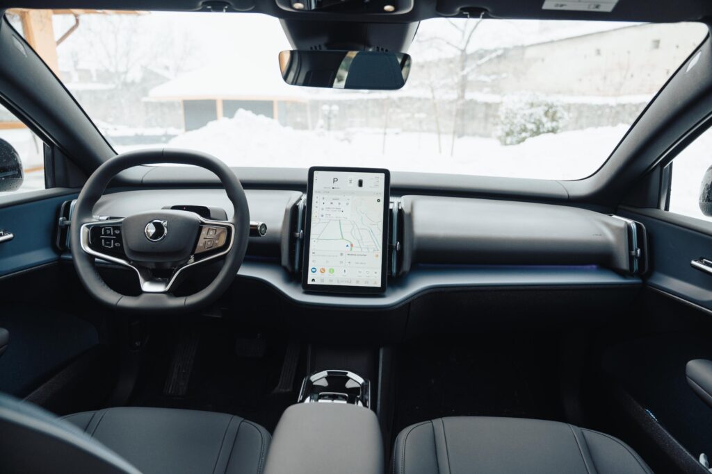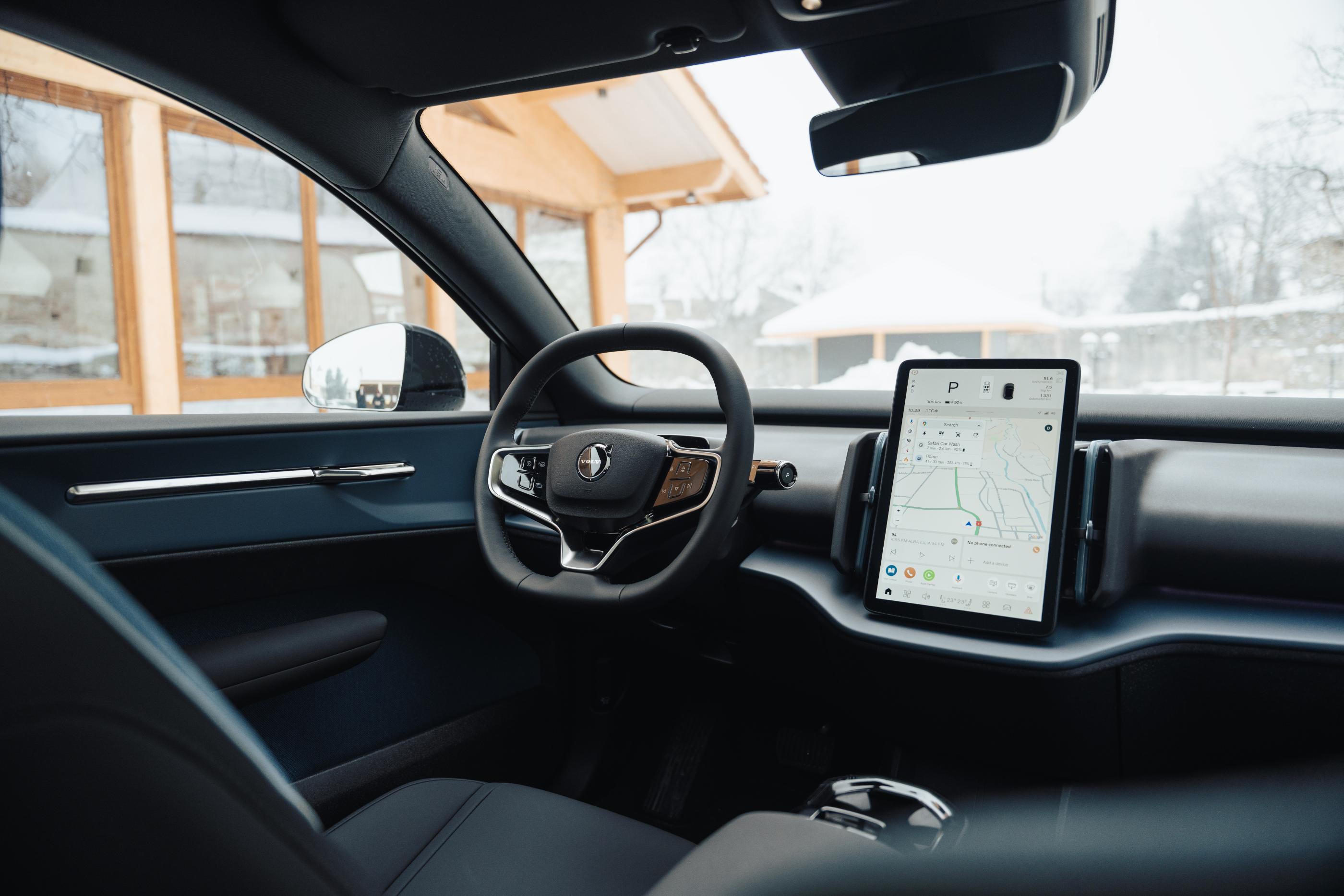 Faptul că EX30 CC nu are un ecran în fața șoferului, iar toate comenzile și informațiile sunt centralizate pe displayul din mijlocul bordului nu mi s-a părut deloc nefiresc sau dificil la utilizare. E drept, au și condus vreo doi ani o Tesla Model 3, deci ceva rămășițe există la nivelul subconștientului când vine vorba de minimalism dus puțin la limită. Mie îmi place soluția asta, dar pentru alții s-ar putea să fie deal breaker.