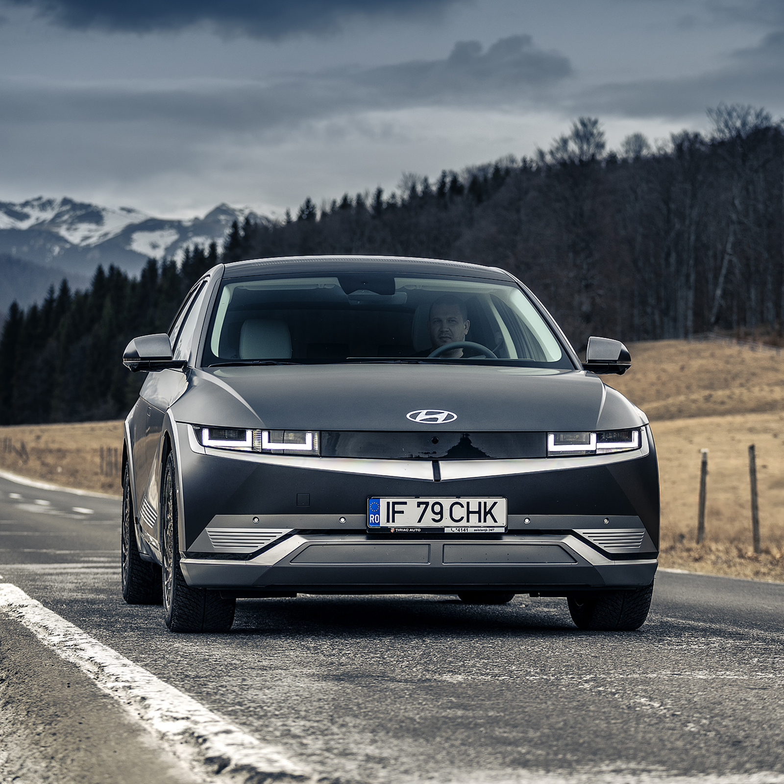 În 31 martie l-am luat pe Bogdan Paraschiv, unul dintre fotografii Autocritica, și am setat destinația Muntele Roșu, o zonă superbă aflată deasupra stațiunii Cheia, pe drumul alternativ DN1A Ploiești-Brașov. Scopul a fost de a trage instantanee cu mașina pentru acest raport de șase luni. Și chiar dacă natura încă nu-și revenise după iarnă, am nimerit o zi excelentă pentru fotografie: cu munții încă înzăpeziți la orizont și cu Ioniq 5 cu liniile sale retro metalice în prin-plan. A fost o zi excelentă pentru noi.